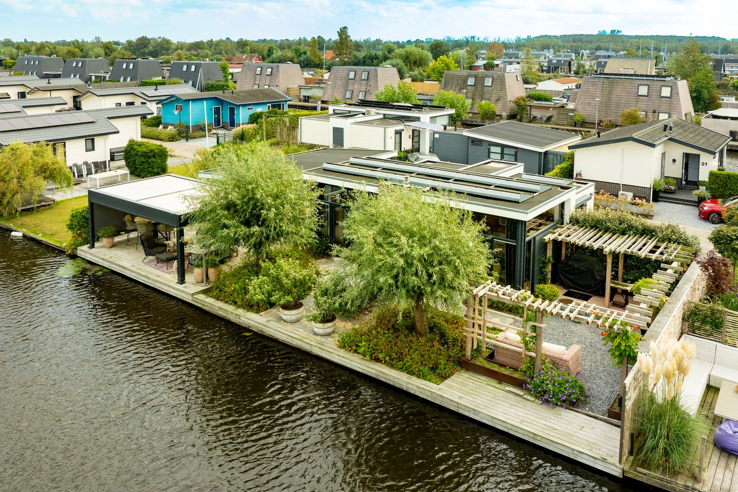 Deze luxe, recreatievilla (top totaal) met boothuis, heerlijk terras, fraai aangelegde tuin, pergola, 12 zonnepanelen, privé aanlegsteiger voor meerdere boten zoals een sloep of (open) zeilboot en eigen parkeerplaatsen is gelegen in park 22 in een vis-, vaar-, zwem- en fietsgebied.