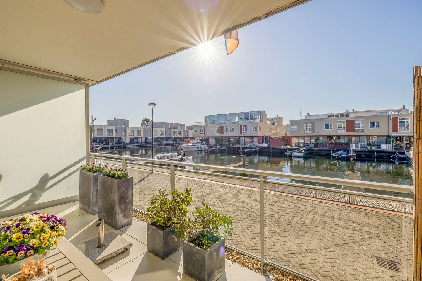 Via de schuifpui (voorzien van een op maat gemaakte Luxaflex hordeur) stap je het ruime balkon op, waar je optimaal kunt genieten van de zon en het prachtige uitzicht op de haven. De tegelvloer is in dezelfde stijl doorgetrokken als de woonkamer, wat zorgt voor een harmonieus geheel en een natuurlijke overgang van binnen naar buiten.