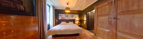 De stoere eetkeuken heeft een uitnodigend ontbijtbarretje voor een snelle kop koffie of een blik in de krant. Glazen (schuif)deuren verbinden de ruimtes op harmonische wijze met de hal en de living. Daar geven diepe, warme kleuren tegenwicht aan de lichte betonnen vloer. De XXL- masterbedroom bevindt zich ook op de begane grond. Een favoriete plek met, net als in de living, weer een fijne houtkachel. Om u terug te kunnen trekken met een boek, om een yogamatje uit te rollen, om muziek te maken of nog anders.
