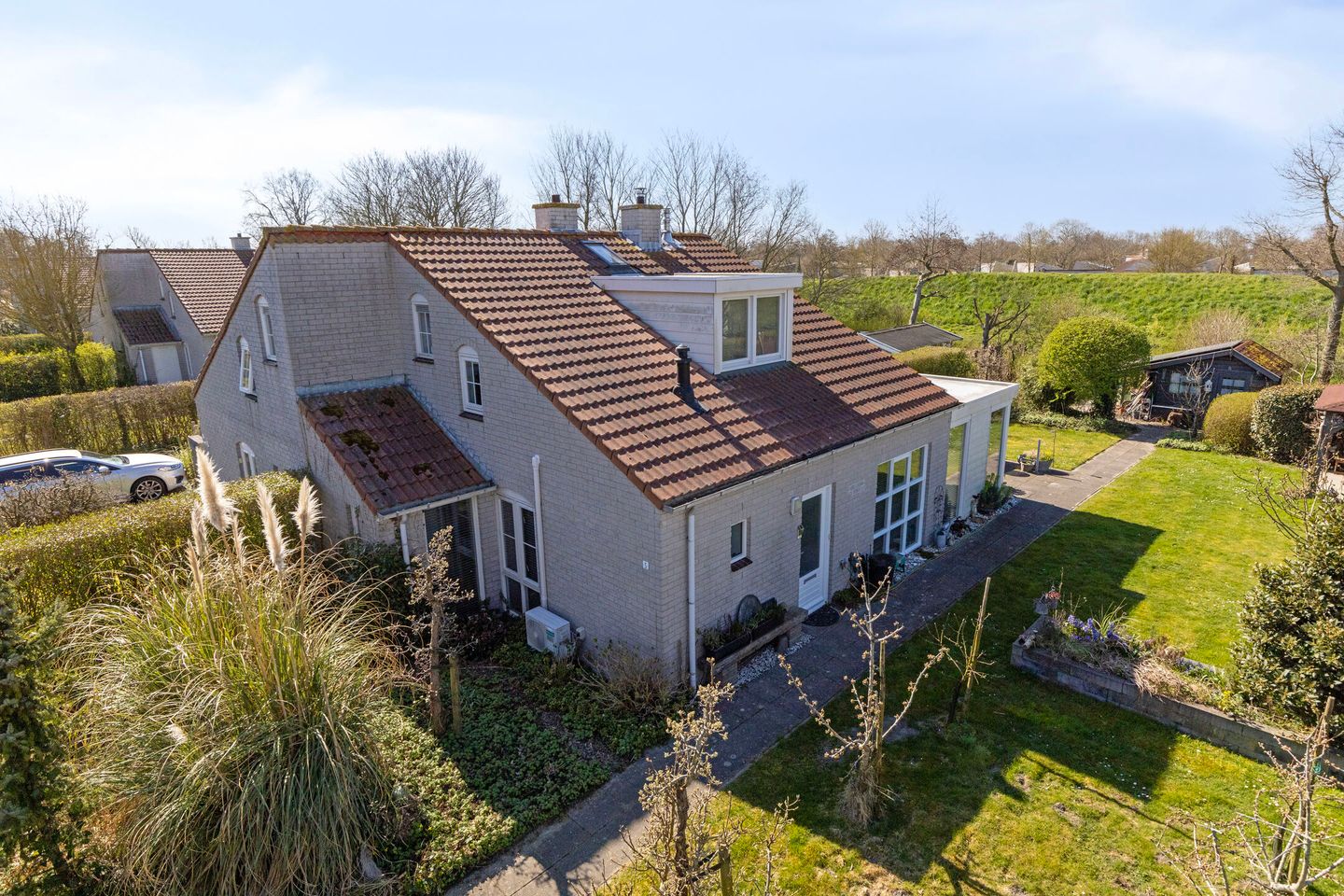 Der umliegende Garten ist grün und sonnig, mit einer Terrasse an der Rückseite, die direkt an die Schiebetür anschließt. Hinten im Garten befindet sich ein Holzschuppen mit Stromanschluss – praktisch zur Aufbewahrung. An der Seite des Hauses gibt es eine zweite Terrasse mit Überdachung, umgeben von Rasen und einer ruhigen Atmosphäre. Zudem gibt es mehrere Beete und Obstbäume.