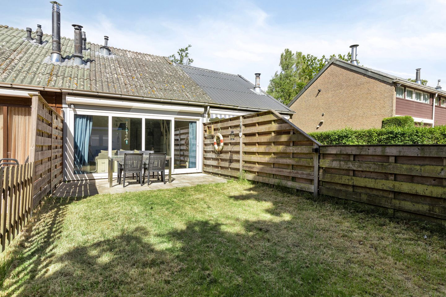 Achter de woning ligt een zonnige tuin met terras, gazon en een handige buitenberging.