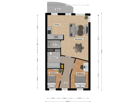 Binnenkomst in de entree/verdeelhal, die toegang geeft tot meerdere vertrekken, waaronder de woonkamer. De woonkamer is ruim en licht en biedt via een deur toegang tot het balkon, waar u prettig van de buitenlucht kunt genieten. De open keukenruimte grenst direct aan de woonkamer; alle aansluitpunten zijn aanwezig, zodat u hier geheel naar eigen smaak een nieuwe keuken kunt realiseren. Aangrenzend bevindt zich een praktische technische ruimte, waar de combi cv/hr-ketel (Vaillant Kombi Kompakt HRE 28/24 A, 2024, huur: € 46,04 p/mnd) is geïnstalleerd en waar tevens de witgoedaansluitingen zijn gesitueerd.