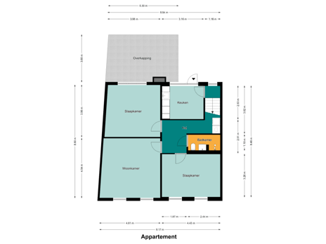 - 19 m² (3,60 meter diep en 5,30 meter breed)