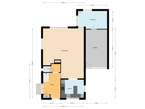 Begane grond: entree, hal met meterkast, toiletruimte en trap naar de 1e verdieping. De woonkamer met open haard en vloerverwarming is ruim en licht en heeft grote ramen met een grote schuifpui naar de achtertuin. Hierdoor heb je veel lichtinval en mooi uitzicht over de tuin. Vanuit de woonkamer loop je door naar de keuken aan de voorzijde van de woning. De keuken is geplaatst in een U-opstelling met diverse inbouwapparatuur en een bar. Ook in de keuken ligt vloerverwarming. Via de woonkamer is er toegang tot de praktische bijkeuken en deze geeft toegang naar de achtertuin en naar de garage.