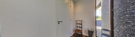 U betreedt via de ruime inkomhal. U vindt er de meterkast, gastentoilet, ruime garderobe en verschillende ramen tot op de grond die al meteen de toon zetten voor de gehele woning. Voldoende natuurlijk licht binnenlaten is hier namelijk een hoofdzaak. Stapt u verder, dan begeeft u zich in de knusse leefruimte waar smalle ramen aan de voorgevel privacy garanderen terwijl de grote raampartij aan de achtergevel het licht wederom genereus binnenlaat. De warmere houttint van de grote houten kozijnen biedt een aangenaam contrast met de wit- en grijstinten van het gebouw. De woonkamer, eetkamer en keuken lopen hier moeiteloos in elkaar over. Dit maakt dat u het aanwezige haardvuur ten allen tijde kunt zien.