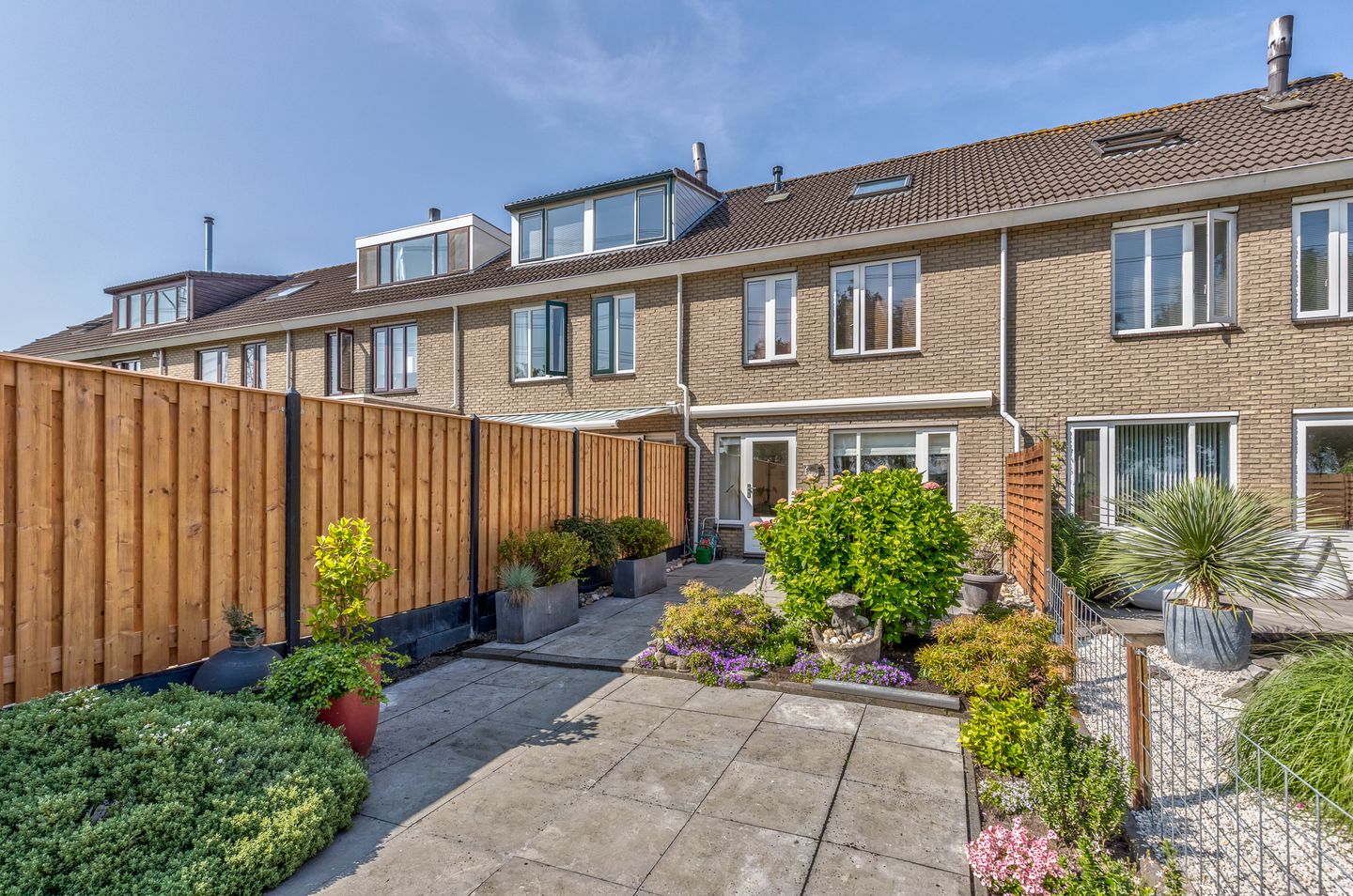De diepe achtertuin is fraai aangelegd met terrassen, borders met planten en houten schuttingen. Er is een buitenkraan, zonwering en een achterom. De tuin grenst aan de achterzijde aan een voetpad en heeft uitzicht op de polder richting Nieuwerkerk.