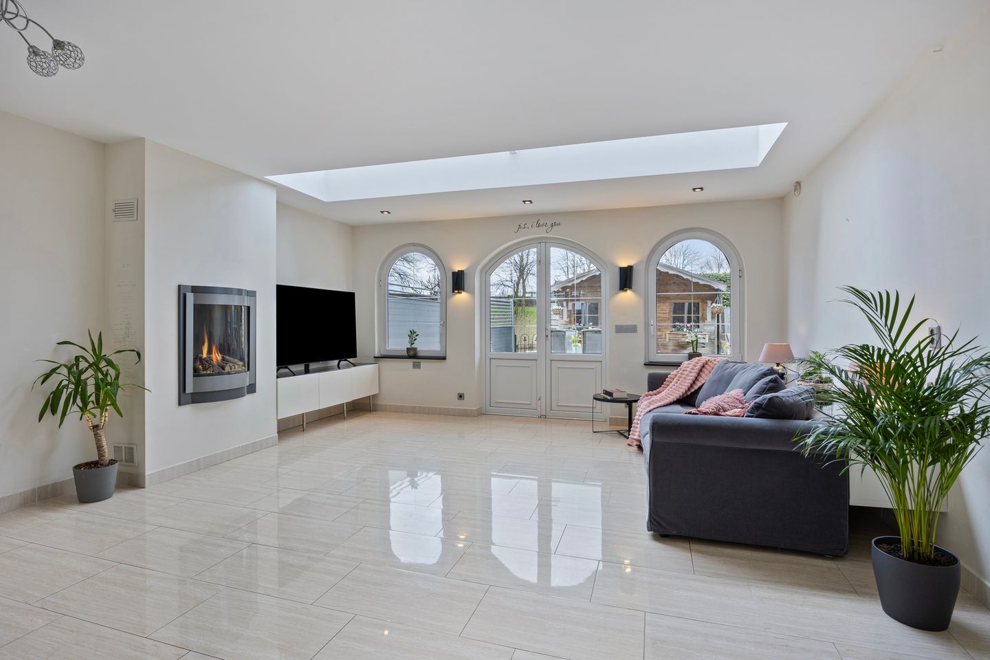 * De woonkamer is voorzien van een aanbouw met lichtstraat en gaskachel. De openslaande deuren geven toegang tot de achtertuin met vrijstaande houten berging. Omdat de ligging maar gedeeltelijk is langs water heeft de woning als pluspunt dat de tuin via een achterom toegankelijk is.