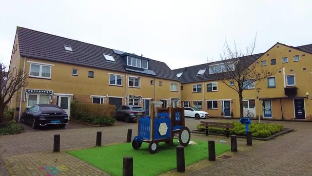 Voortuin, grenzend aan een gezellig en kindvriendelijk (speel)pleintje, voorzien van sierbestrating, zonwering voor keukenraam (markies), buitenkraan en parkeergelegenheid.