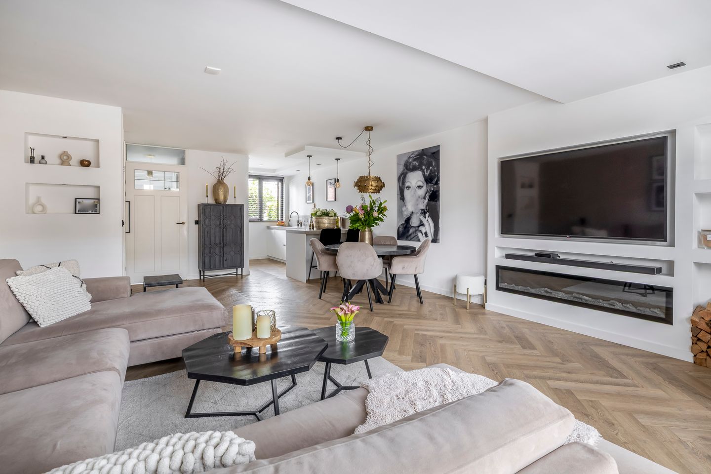 Bij binnenkomst valt meteen de ruime en open indeling op. De woonkamer is stijlvol afgewerkt met een prachtige Bodiax visgraatvloer, strakke wanden en veel lichtinval door de grote raampartijen aan de voor- en achterzijde. De zithoek met een grote cinewall met sfeerhaard biedt volop plek voor het hele gezin en loopt vloeiend over in het eetgedeelte en de moderne open keuken. Deze keuken is van alle gemakken voorzien, met hoogwaardige inbouwapparatuur zoals een Bora kookplaat, Quooker en Siemens apparatuur, én voldoende opbergruimte. Hier is het een genot om te koken én samen te komen.