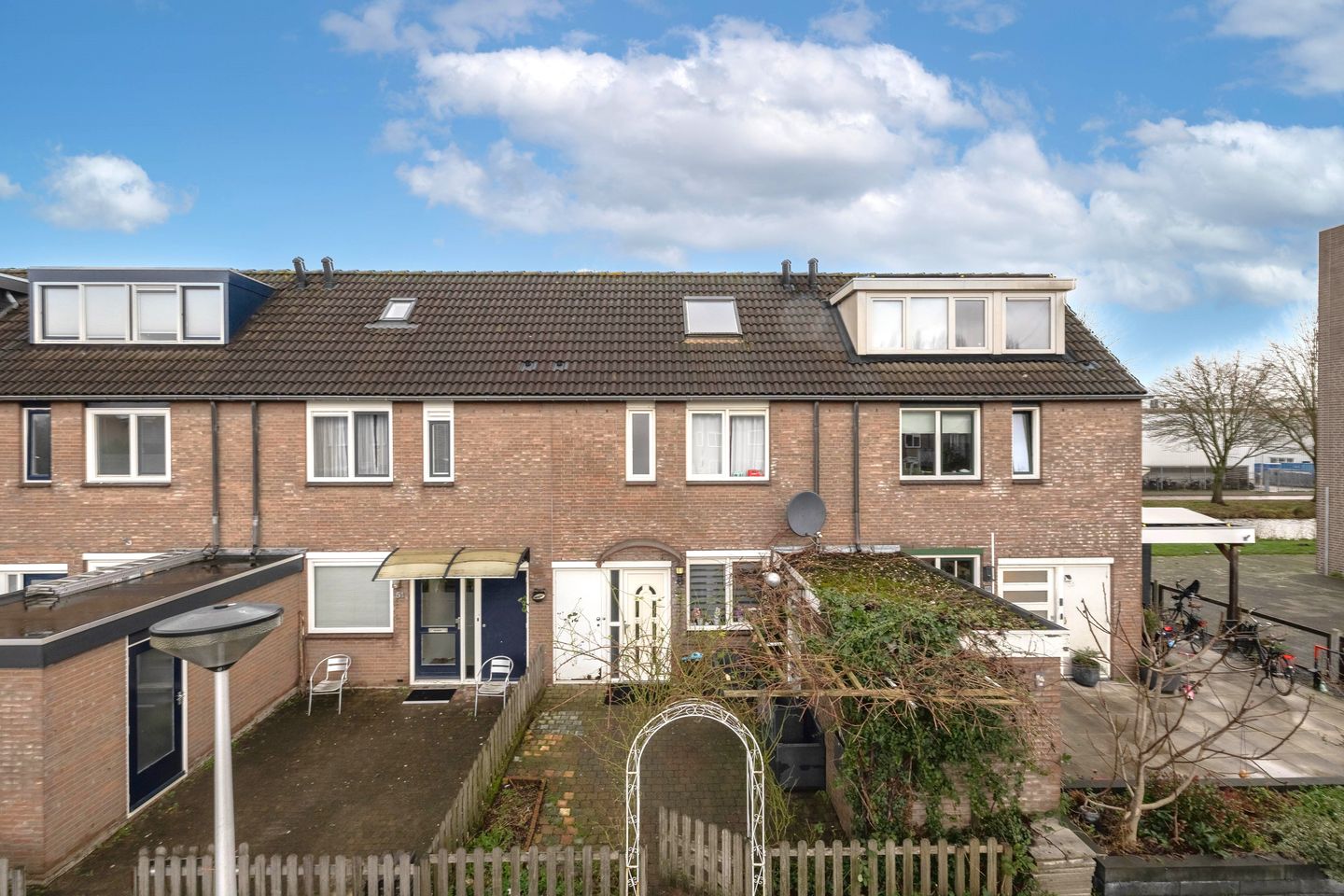 De voortuin (22m²) grenst aan een rustig hofje met ruime parkeergelegenheid.