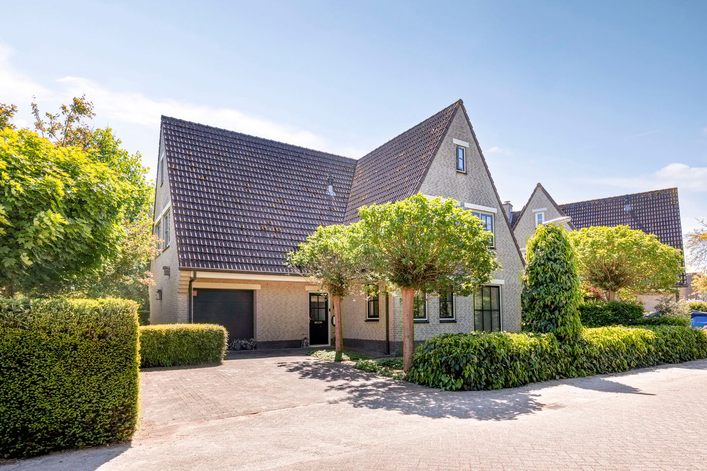 De tuin rondom de woning is onder architectuur fraai aangelegd door het gerenommeerde tuinbedrijf "De Briellaerd". De tuin is mooi beplant met bomen en vaste planten, hierbij is rekening gehouden dat de tuin onderhoudsvriendelijk in gebruik is. De achterzijde ligt gunstig op het zuidoosten, heeft veel privacy en een vlonder aan het water met uitzicht richting de Bermweg. Er staat een ruim onderheid tuinhuis met betonnen vloer, stenen frame en houten optrek. Het tuinhuis is opgedeeld in een veranda en een berging (met zolder) gedeelte. De veranda is een heerlijke plek om te barbecueën en fijn buiten te zitten. De tuin is zo ingericht dat er altijd een plekje in de zon of desgewenst schaduw te vinden is. Om verzakking tegen te gaan liggen de terrassen op piepschuim en de tuin is in 2022 opgehoogd. De groen-wit gestreepte aluminium markiezen geven de woning een charmante uitstraling en houden de zon uit de woonkamer en hoofdslaapkamer. Aan de voorzijde is er voldoende ruimte voor het parkeren van 2 auto's op eigen terrein en een oplaadpunt voor de elektrische auto.