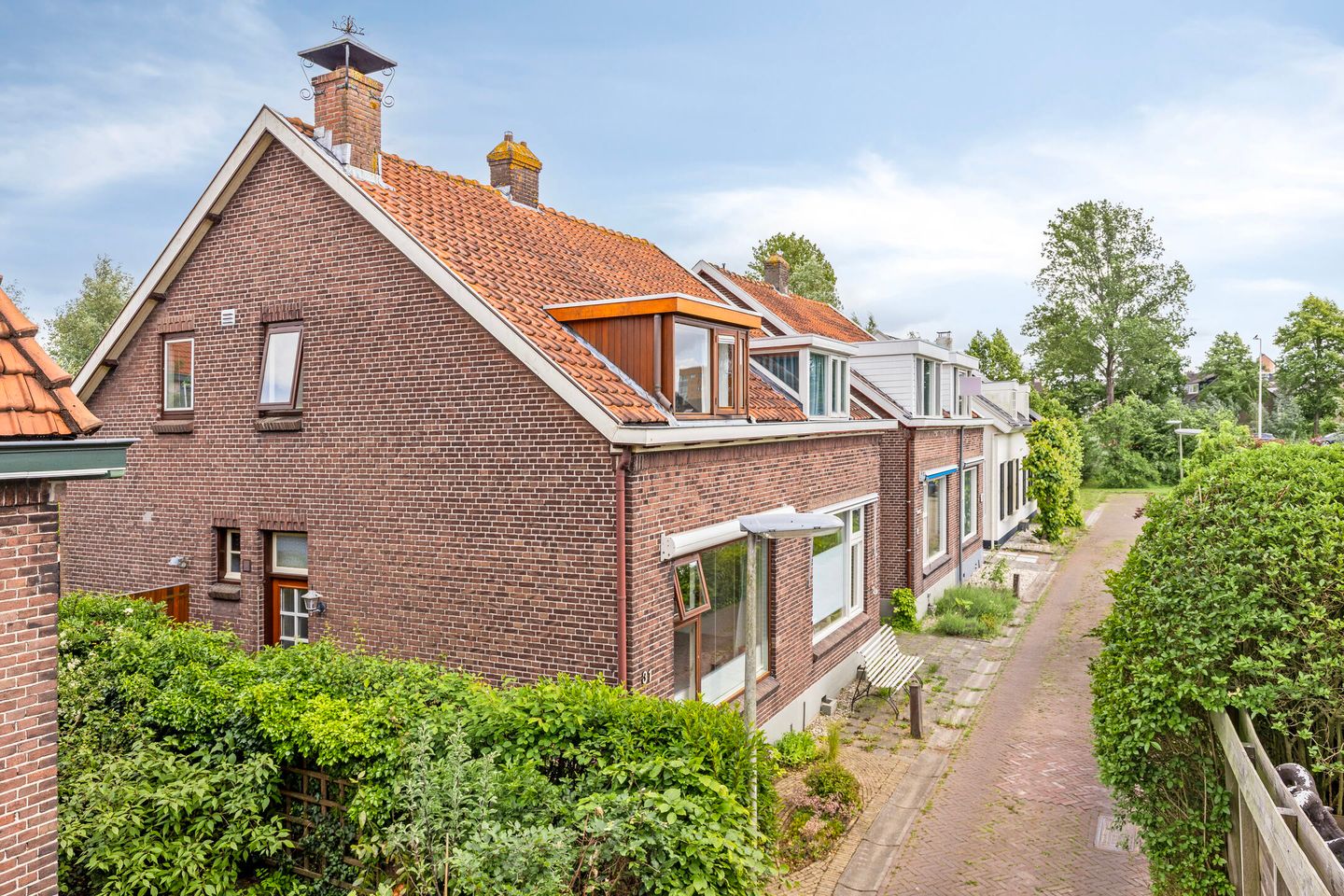 De zij-tuin is ook voorzien van sierbestrating, groene borders, een gesloten poort naar de achtertuin en toegang tot de woning.