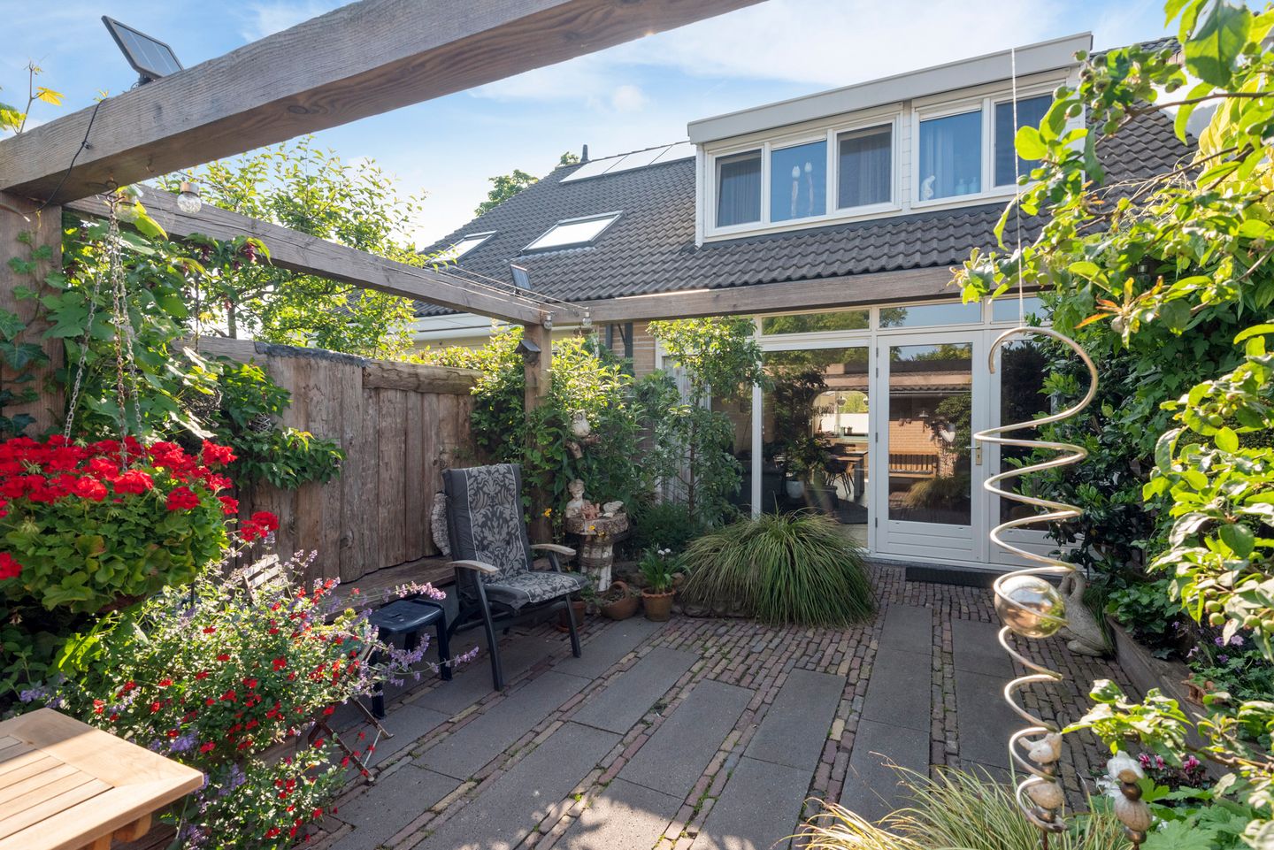 De achtertuin is werkelijk prachtig aangelegd, met veel groen, mooie beplanting en een fijne indeling. Hier zit u heerlijk: rustig, privé en met de zon op de juiste momenten. De ligging op het noordwesten betekent dat u ’s middags en ’s avonds kunt genieten van de zon – ideaal voor een ontspannen borrel of barbecue na het werk. Voor extra comfort is aan de achterzijde een elektrisch zonnescherm geplaatst, zodat u ook op warme dagen lekker beschut buiten kunt zitten. Ook aan de voorzijde is gedacht aan zonwering: hier zorgt een markies voor een charmante uitstraling én verkoelende schaduw binnen.