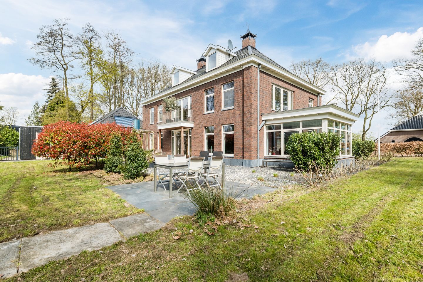 Rondom de woning ligt een fraai aangelegde, parkachtige tuin met een combinatie van gazon, sierbestrating, borders en fruitbomen. Meerdere terrassen zorgen ervoor dat er altijd een fijne plek is in de zon of juist in de schaduw. Onder de overkapping is een gezellige loungehoek gerealiseerd, perfect om lange avonden buiten door te brengen.