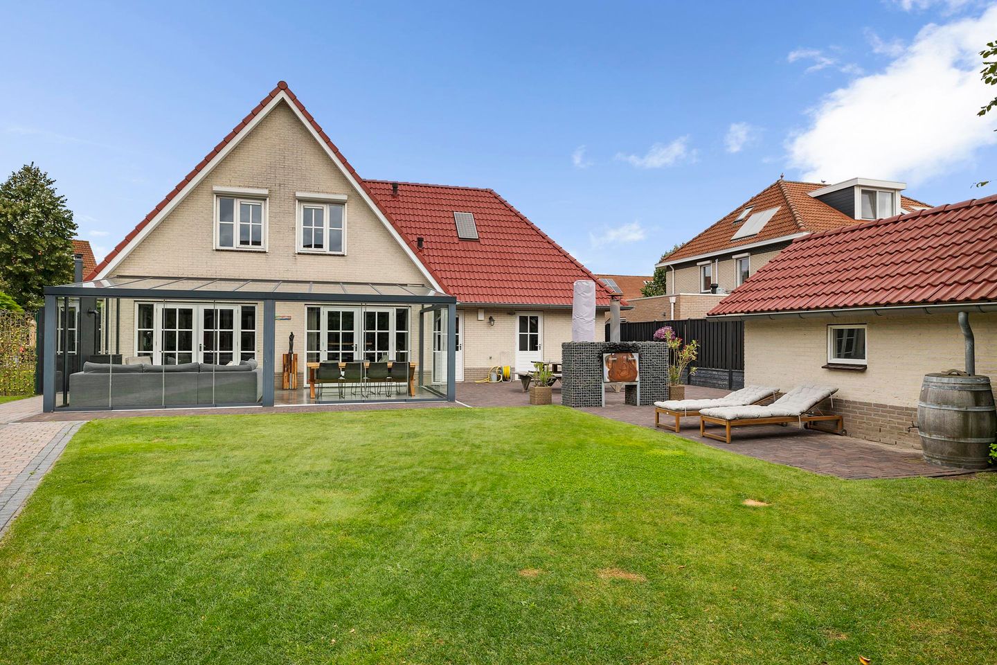 - Aan de achtergevel aangebouwde serre met hardglazen schuifdeuren en glazen dak met elektrisch bedienbare zonwering.