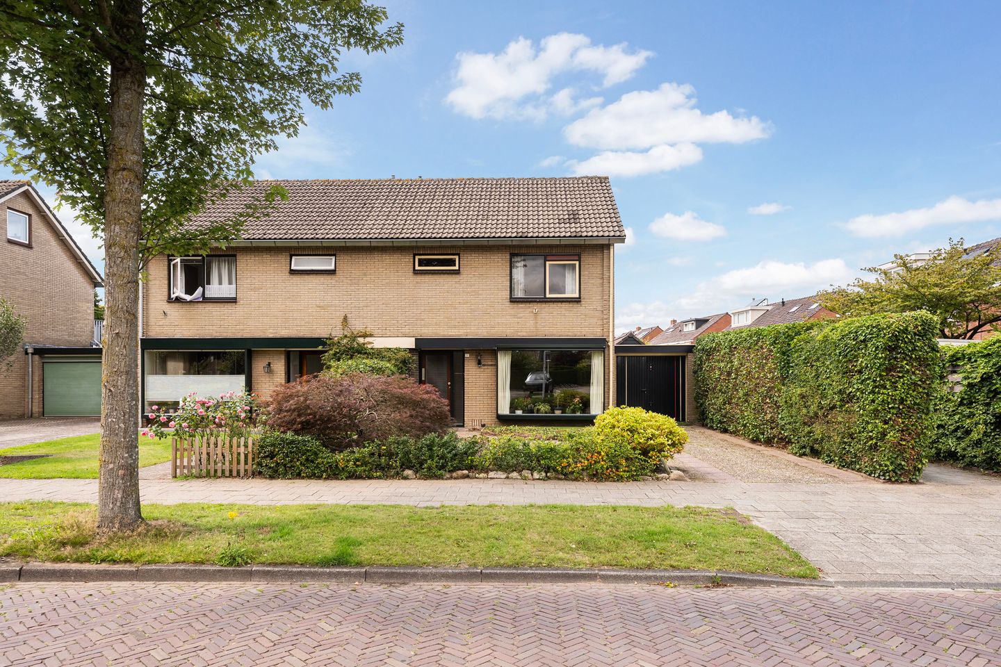 De achtertuin ligt op het westen en is zeer diep, verzorgd aangelegd met gazon (kunstgras), borders en twee terrassen. De overkapping biedt een fijne plek in de schaduw, tevens is hier extra opslagruimte op een bergzoldertje. Daarnaast is er een bron met grondwaterpomp aanwezig voor beregening. Via een poort is er toegang naar de steeg aan de zijkant van de woning, de oprit aan de voorzijde biedt parkeergelegenheid op eigen terrein. De garage met loopdeur is geschikt voor opslag of stalling.