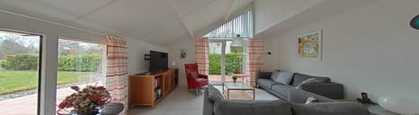 De woonkamer geeft via een schuifpui toegang tot het ruime terras en tuin.