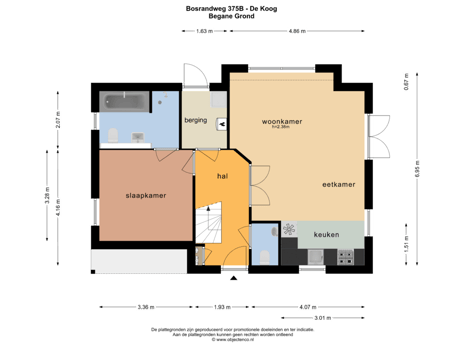 Entree, hal, toilet met fonteintje, meterkast, royale woonkamer met openslaande deuren naar het terras, open keuken, ruime (ouder)slaapkamer, badkamer met tweede toilet en een ruime inpandige berging.