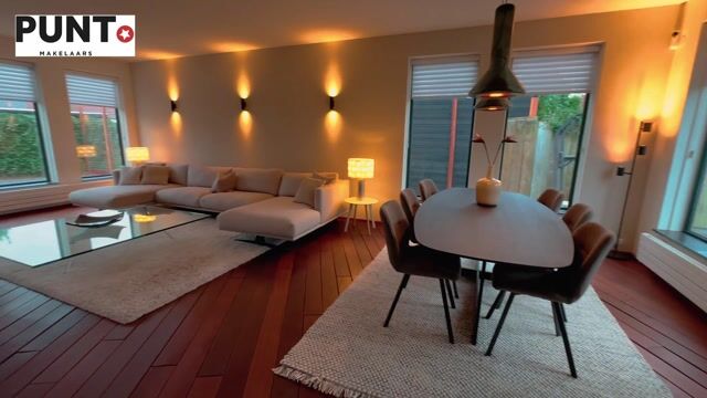 Dankzij de unieke glasgevel aan de achterzijde over twee verdiepingen is de woning heerlijk licht en kun je zowel binnen als buiten de hele dag van de zon genieten. Bij het ontwerp is gekozen voor een maximale open verbinding tussen de woonkamer en de overige ruimtes waardoor een open sfeer ontstaat en onderlinge verbinding centraal staat. Vanuit de woonkamer is er via twee openslaande deuren toegang tot de tuin. De woonkamer is voorzien van een robuuste hardhouten vloer, gas openhaard met RVS rookkanaal en extra hoge plafonds (2.78 m).