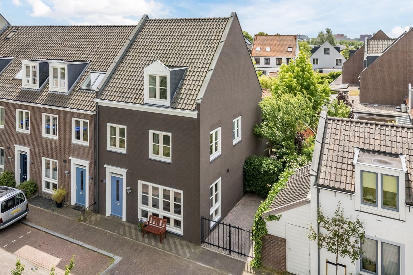 The wonderfully sunny south-facing garden offers more than enough space for a cozy lounge set, dining table, and BBQ. The beautiful green trees provide refreshing shade during hot summers, and the enclosed section of the garden on the west side of the house is ideal for parking a second car or storing bicycles, but of course, it can also be incorporated into the main garden area.