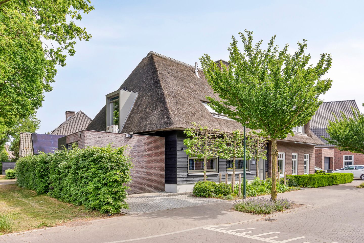 - Deze rietgedekte, modern afgewerkte halfvrijstaande woning is gelegen in een nieuwe wijk aan de rand van De Mortel.