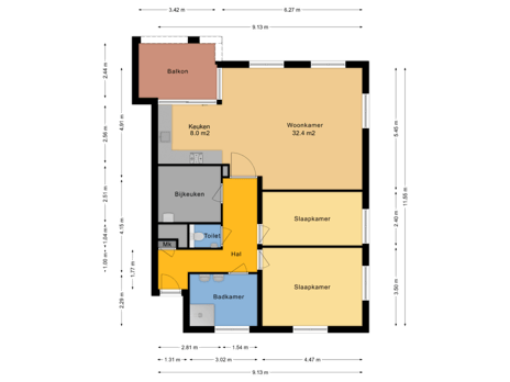 Eveneens via de hal bereikt u de twee slaapkamers, bijkeuken, toilet, meterkast en badkamer.