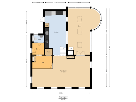 Bij binnenkomst via de hal vind je het toilet, de meterkast en een garderobehoek. Vanuit hier betreed je de royale woonkamer, die dankzij de houten vloer en sfeervolle gashaard een warme uitstraling heeft. De halfopen woonkeuken is royaal opgezet en voorzien van veel bergruimte, een 5-pits gaskookplaat, aansluiting voor wasmachine en droger en een losstaande koelkast die achterblijft.