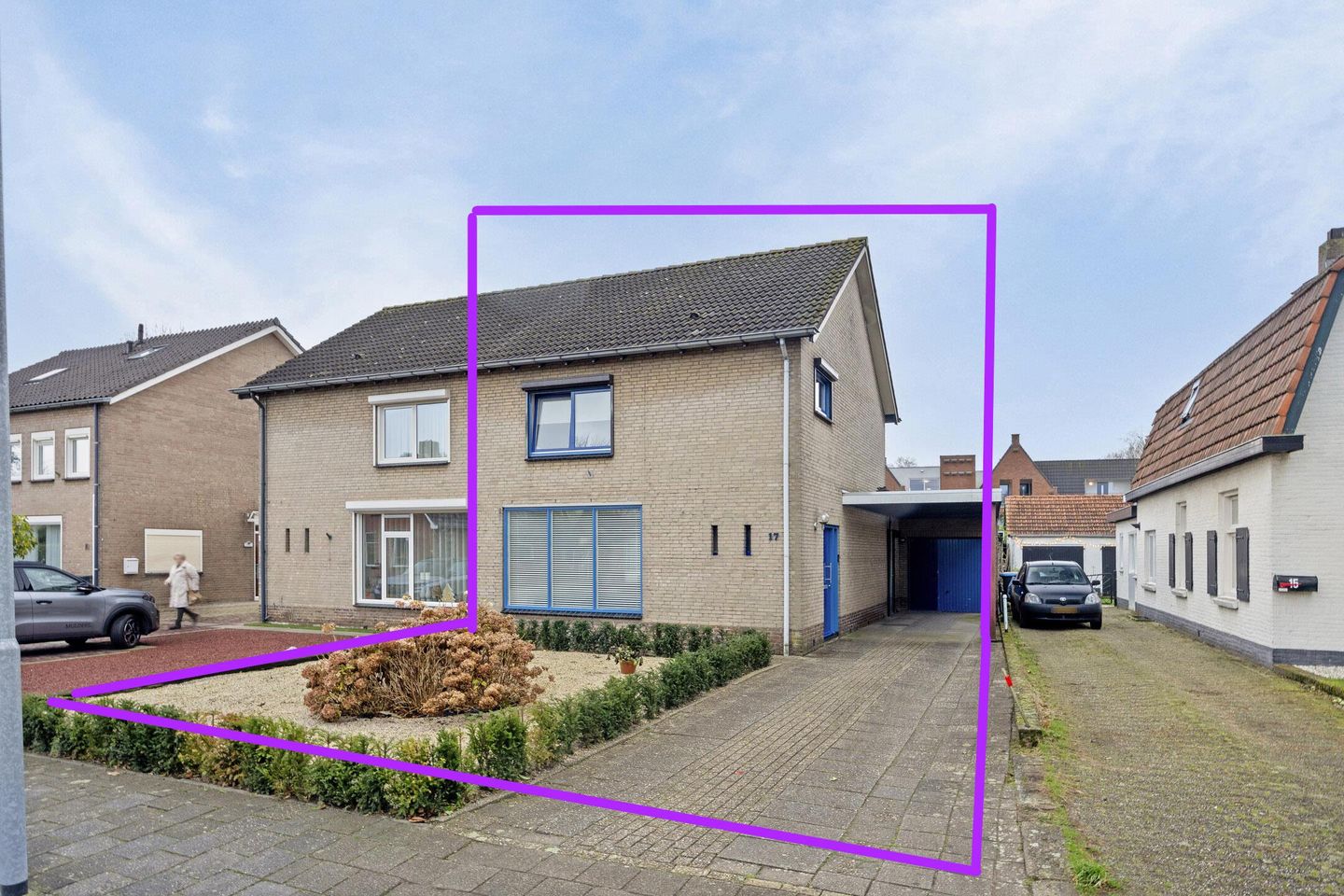 De voortuin is verzorgd aangelegd met beplanting, grind, bestrating en een eigen oprit met voldoende parkeergelegenheid voor twee auto's. De oprit geeft u toegang tot de voordeur, de carport en de vrijstaand stenen garage.