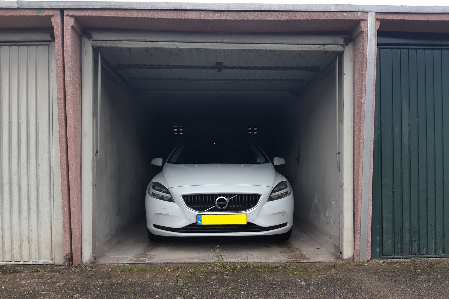 De garage is gelegen op eigen grond; vol eigendom. Het pleintje is de openbare weg die toegang geeft tot de garages en de achtertuinen van de aangrenzende woningen.