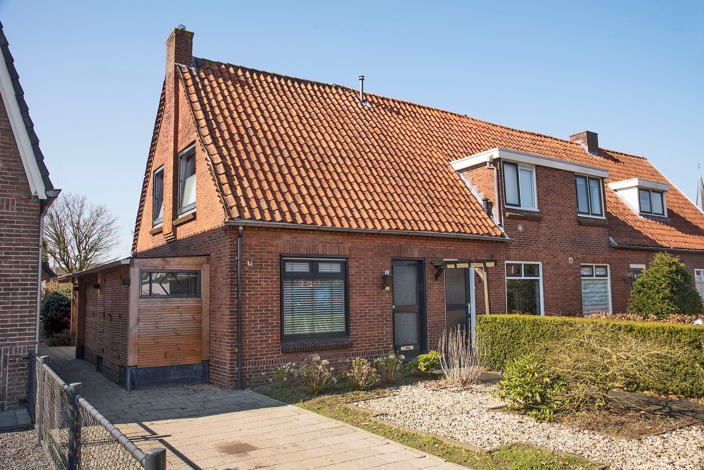 Achter de woning wacht een fijne verrassing: een veranda waar je al vroeg in het voorjaar geniet van de eerste zon en waar je in de zomeravonden heerlijk beschut buiten zit. Daarnaast beschikt de woning over een praktische berging aan de zijkant van het huis, ideaal voor bijvoorbeeld fietsen of gereedschap. Verderop in de tuin bevindt zich nog een vrijstaande berging, wat zorgt voor extra bergruimte. Via de achterom is de tuin bovendien goed bereikbaar. Ook aan de voorzijde is het praktisch geregeld: de woning beschikt over een eigen oprit, waardoor je 2 auto's op eigen terrein kunt parkeren.