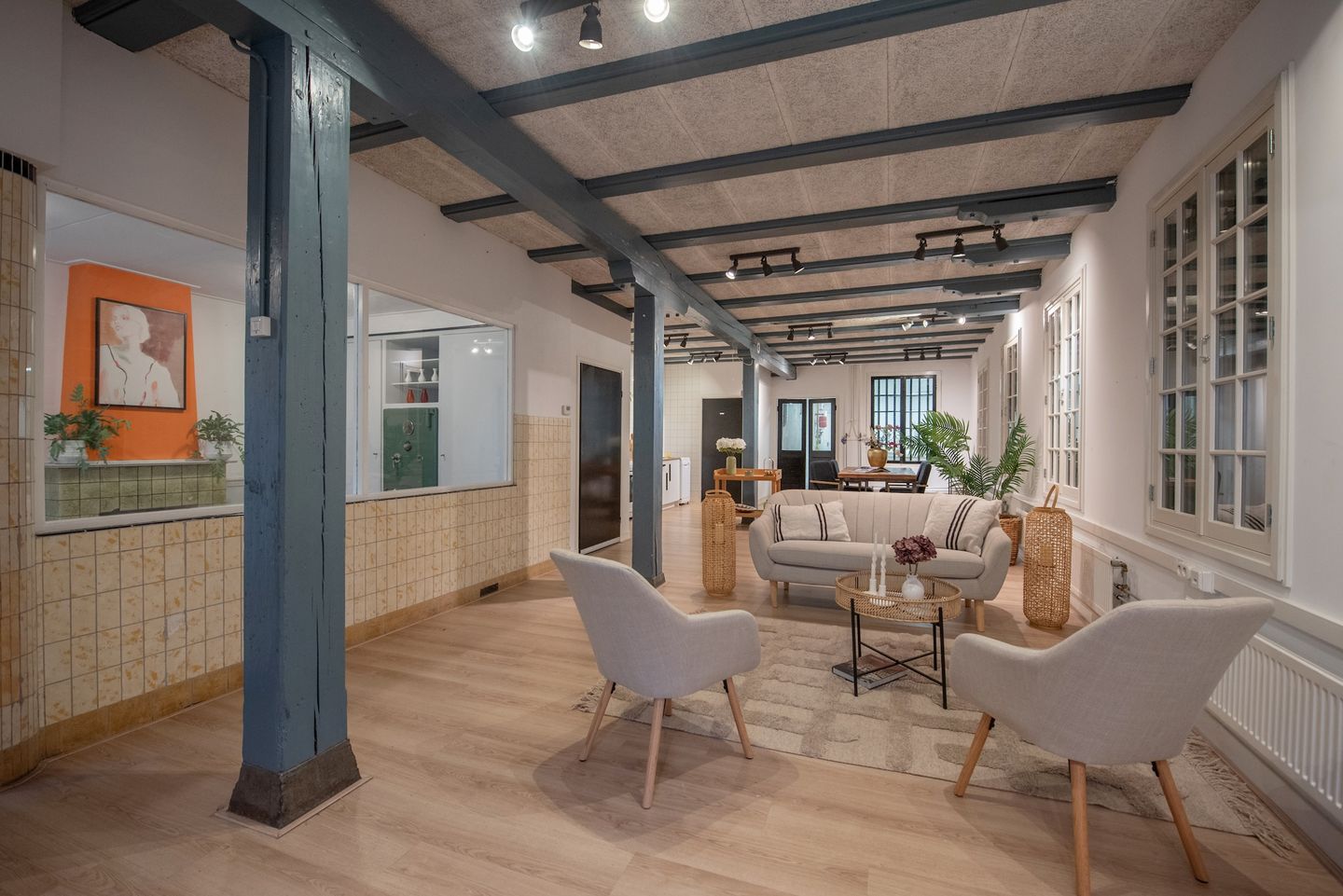 Entree met dubbele deuren en kleine hal. Toegang naar de zijruimte welke vele mogelijkheden kent. Enorme, ruim tien meter lange ruimte met een industriële uitstraling door de fraaie balken. Aan de zijkant bevinden zich een viertal originele kozijnen. Achterin deze ruimte ligt de open keuken met daarachter het toilet. Middels openslaande deuren is een volgende ruimte aan de achterzijde te gebruiken, thans ingericht als riante slaapkamer. Via deze ruimte is de achterzijde van dit object bereikbaar met de entree naar de garage. Deze is bereikbaar middels een afgesloten hek via de Handboogstraat. De garage staat op een apart perceel, maar kan ook aan het appartement toegevoegd worden, waardoor er een extra slaapkamer gerealiseerd kan worden