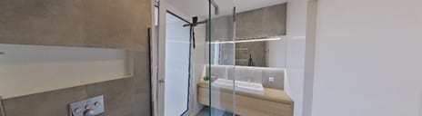 Ruime hal, modern toilet met fontein, berging voor technische installaties en een aparte ruimte voor wasmachine en droger. Vanuit de hal toegang tot een grote slaapkamer met een ingerichte inloopkast. Stijlvolle badkamer met inloopdouche, design wastafelmeubel en spiegel.
