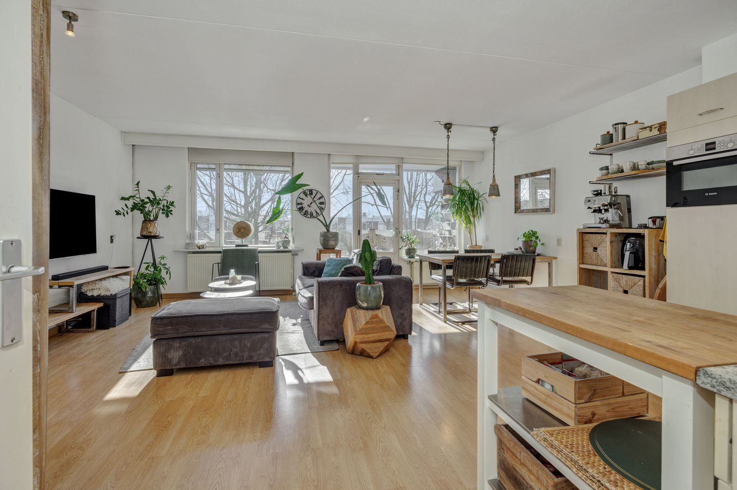 De ruime en lichte woonkamer is voorzien van grote raampartijen aan de voorzijde die zorgen voor veel lichtinval. Vanuit de woonkamer hebben we toegang tot het zonnige balkon op het zuidwesten.