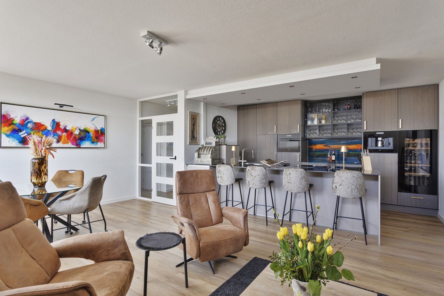 Vanuit de lift bereik je een portaal met toegang tot dit appartement. Binnenkomst in de ruime hal, met toegang tot de verschillende vertrekken en naar de living met een heerlijk licht karakter. De luxueuze keuken staat in verbinding met de woonkamer en beschikt over een eigentijdse maatwerkinrichting, veel werk- en bergruimte en een mooi keramisch blad. De keuken is voorzien van een schiereiland met bar, wat zorgt voor extra werkruimte en een sfeervolle verbinding tussen koken en wonen. De keuken is uitgerust met high-end inbouwapparatuur, zoals o.a. een inductiekookplaat met geïntegreerde afzuiger én weegschaal, wijnklimaatkast, combi-oven, koel-/vrieskast, Quooker en vaatwasser. De grote raampartij zorgt voor een overvloed aan daglicht en biedt een prachtig, onbelemmerd uitzicht op de omgeving. De living is afgewerkt met een mooie pvc-vloer.