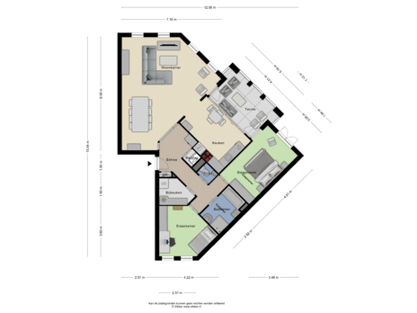 Zodra je het appartement binnenkomt valt de speelse indeling op. Vanuit de hal zijn alle vertrekken bereikbaar, zo tref je daar de meterkast, de cv-ruimte, toilet en de berging/wasruimte aan.