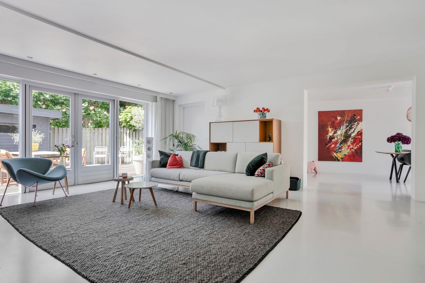 - Strak afgewerkte, riante en speels ingedeelde woonkamer en moderne gietvloer.