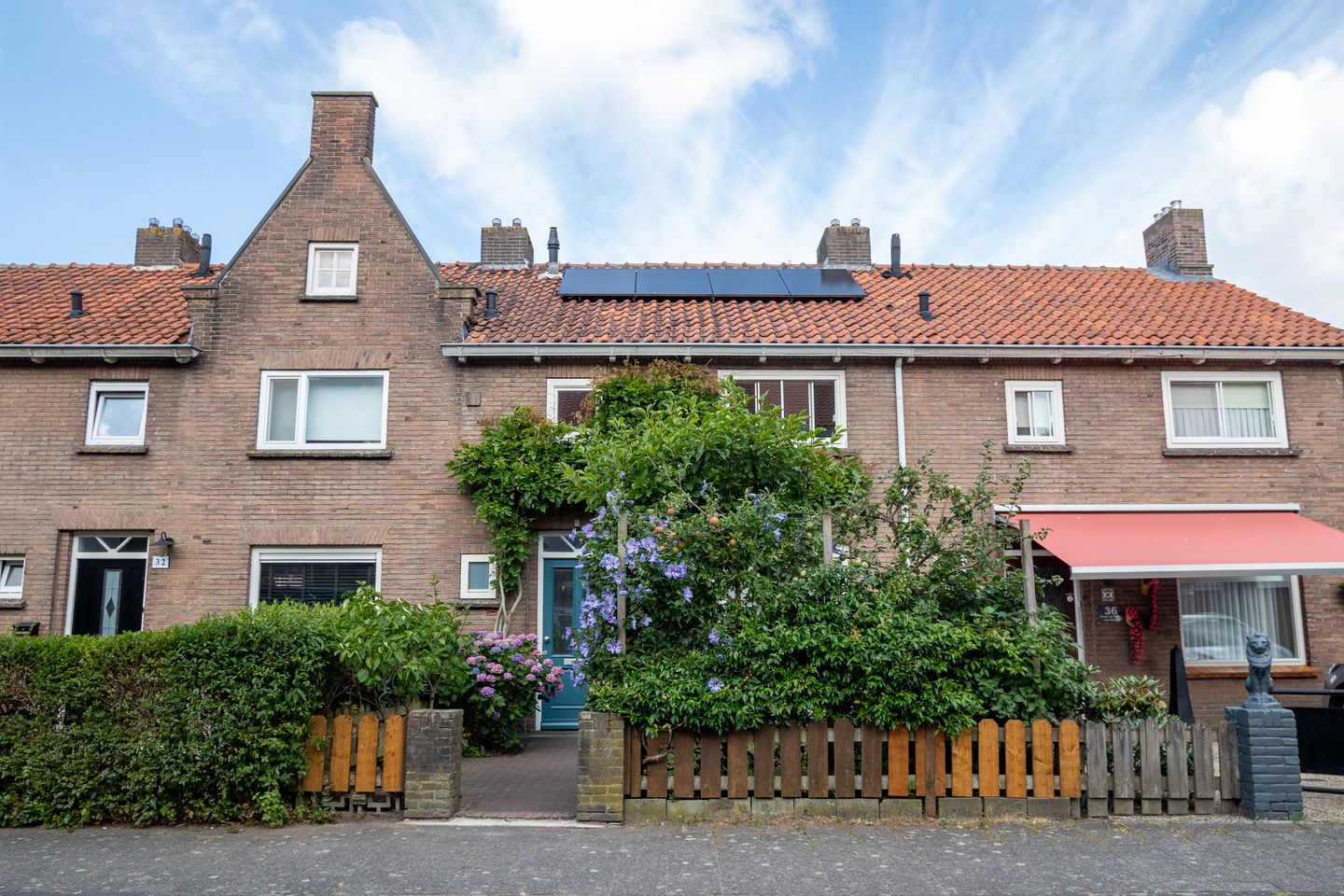 Zowel de voor- als achtertuin zijn groen, sfeervol en goed onderhouden. Achter de woning ligt een fijn terras, professioneel aangelegd kunstgras (2023), borders met beplanting en bomen, en een handige berging voor fietsen en tuingereedschap. Door de volwassen begroeiing geniet je hier volop van je privacy. Achterin de tuin bevindt zich een poort/ achterom naar de achter gelegen brandgang.