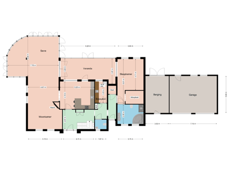 De aangebouwde garage (ca. 40 m2) is voorzien van twee elektrische roldeuren en een bergzolder. Tussen de garage en het woonhuis is een extra bergruimte (ca. 20 m2).
