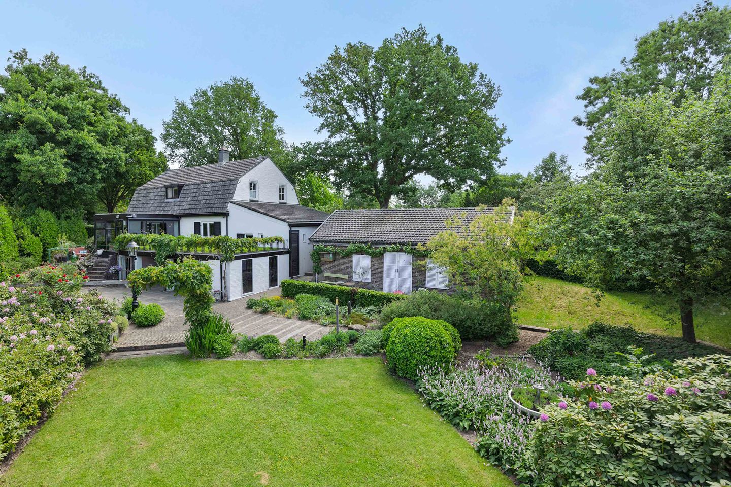 Al bij binnenkomst in de indrukwekkende hal ervaar je de sfeer en het karakter van dit bijzondere huis. Het hoge plafond, de stijlvolle trappartij en de rijke afwerking zetten meteen de toon. De riante woonkamer verrast met de vele raampartijen, het open karakter en bovenal de enorme vide, die zorgt voor een fantastisch ruimtelijk effect. Door de vide is er een prettige verbinding met de erboven gesitueerde study en prachtig zicht op een smeedijzeren hekwerk en glas-in-lood ramen. Tussen het zit- en eetgedeelte fungeren gietijzeren pilaren op speelse wijze als soort roomdivider. De woonkamer is afgewerkt met een parketvloer, fraai balkenplafond, gashaard en dubbele deuren naar de heerlijk lichte serrekamer, waar je prachtig uitzicht hebt op de tuin en de achtergelegen landerijen. Via een tuindeur bereik je vanuit de serre een gezellig terras met een trap naar de iets lager gelegen tuin. De keuken is zowel vanuit de hal, als vanuit de woonkamer bereikbaar en is robuust, praktisch én stijlvol met een zinken lambrisering als karakteristiek detail. Aan de linkerzijde van de woning bevindt zich een grote aanbouw, die is voorzien van een eigen entree, 2 kamers, toilet en een badkamer. Ideaal voor levensloopbestendig wonen of wellicht als aanleun- of kangaroewoning.