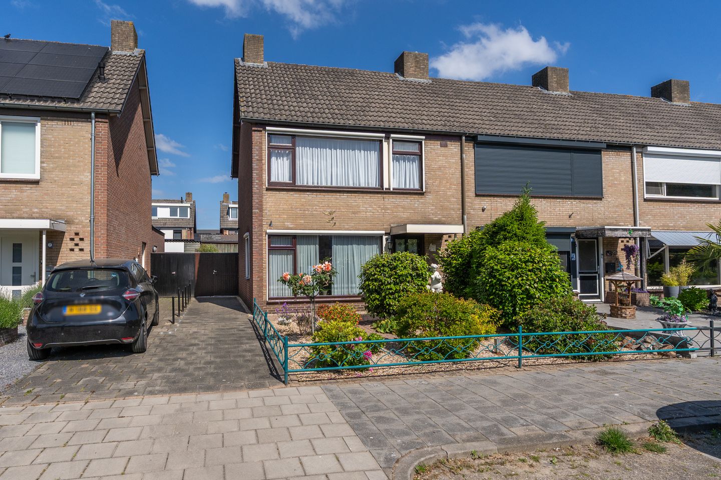 Bij aankomst bereik je de woning via een verzorgde voortuin en een overkapte entree. De achtertuin is volledig bestraat met siertegels en beschikt over een royaal terras, ideaal voor buitenleven en ontspanning. Aan de linkerzijde van de woning bevindt zich een oprit met dubbele poort, die toegang biedt tot een hoge, ruime overkapping waar voorheen een caravan gestald werd — perfect als overdekt zitgedeelte. Aan de rechterzijde is een grote berging aanwezig, geschikt voor het opbergen van tuinmeubels, fietsen of gereedschap. De tuin is strak aangelegd, onderhoudsvriendelijk en voorzien van een praktische achterom.