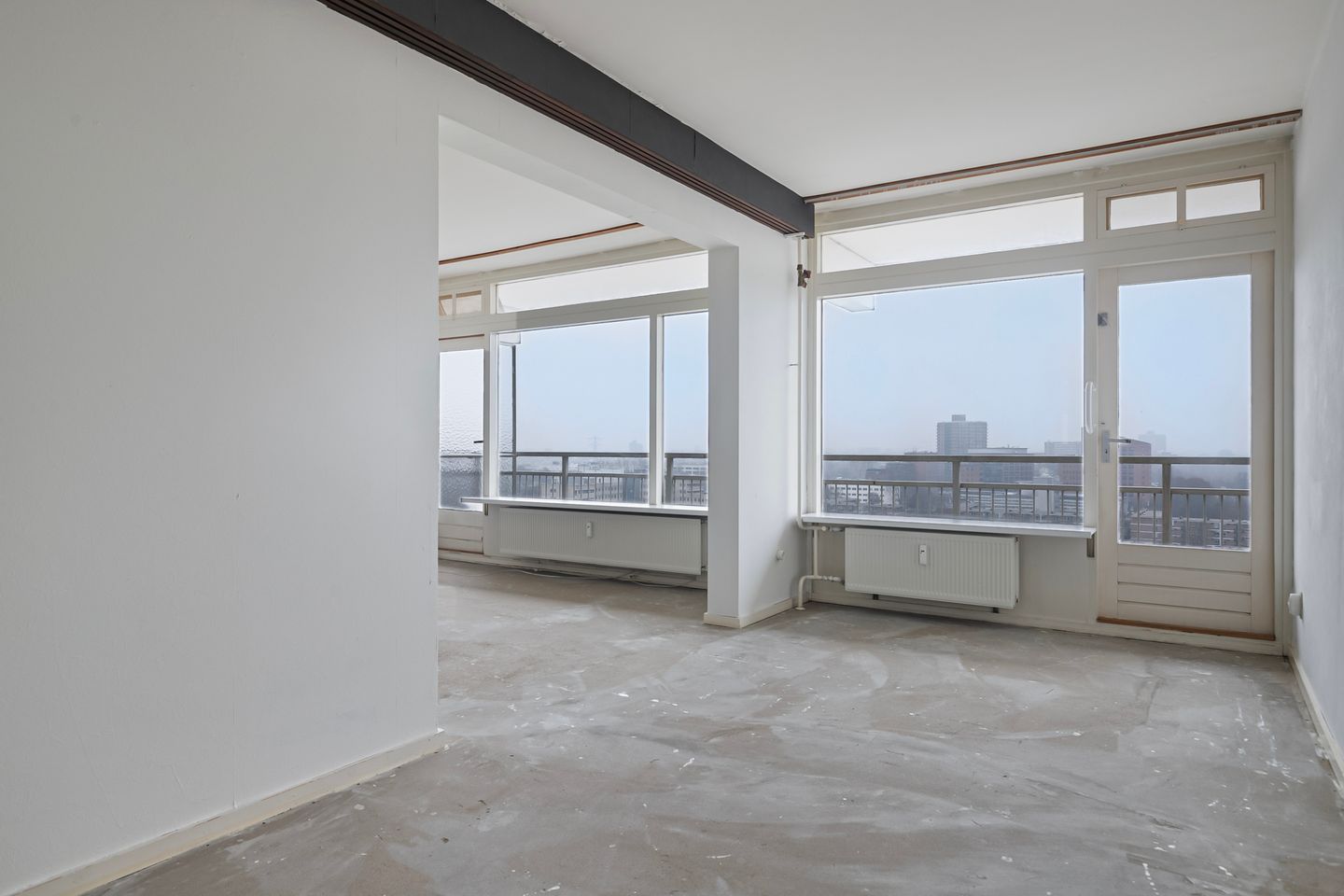Indeling: Zeer verzorgd gemeenschappelijk entree met video-intercom en kantoor van de huismeester. Lift naar de 11e verdieping, via galerij naar de voordeur van het appartement. Tochtportaal met meterkast. Centrale hal met toegang tot alle vertrekken en diepe bergkast. Lichte, en door de bijgetrokken zijkamer, heel ruime woon-/eetkamer met twee deuren welke toegang geven tot het balkon over de gehele breedte van de woning. Balkon gelegen op het zuidoosten, waar je van de vroege ochtend tot einde van de middag van de zon kan genieten. Badkamer met douche, wastafel en wasmachine aansluiting. 2 slaapkamers. Eenvoudige keuken met boiler.