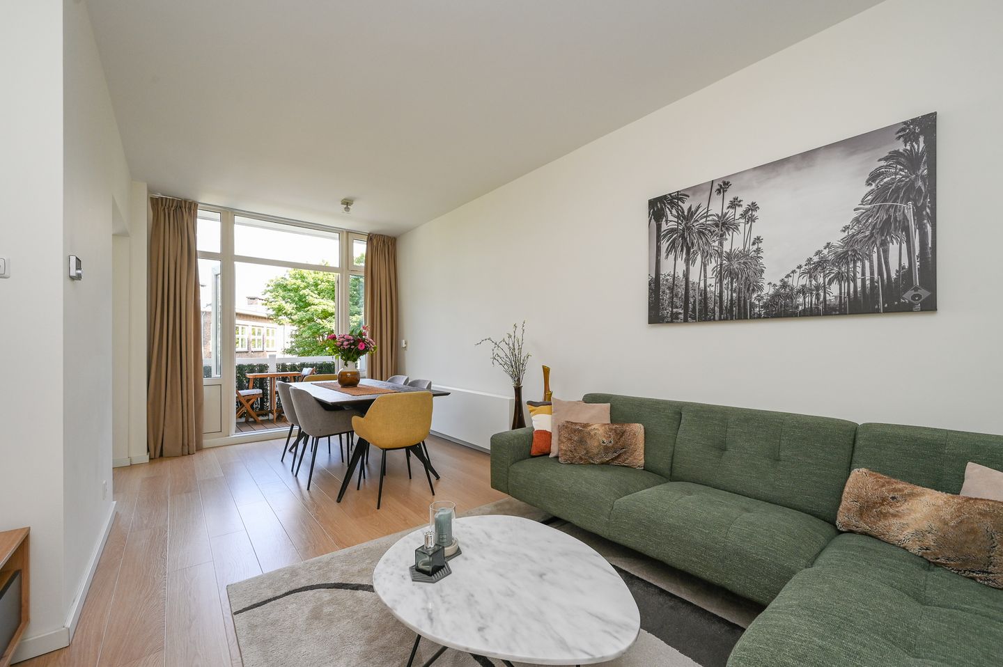 De sfeervolle living is gelegen aan de achterzijde en beschikt over openslaande deuren naar het balkon met een vrij uitzicht. De halfopen keuken is uitgevoerd in hoekopstelling en voorzien van een 4-pits gaskookplaat, afzuigkap, combi-oven, vaatwasser en koel-/vriescombinatie.
