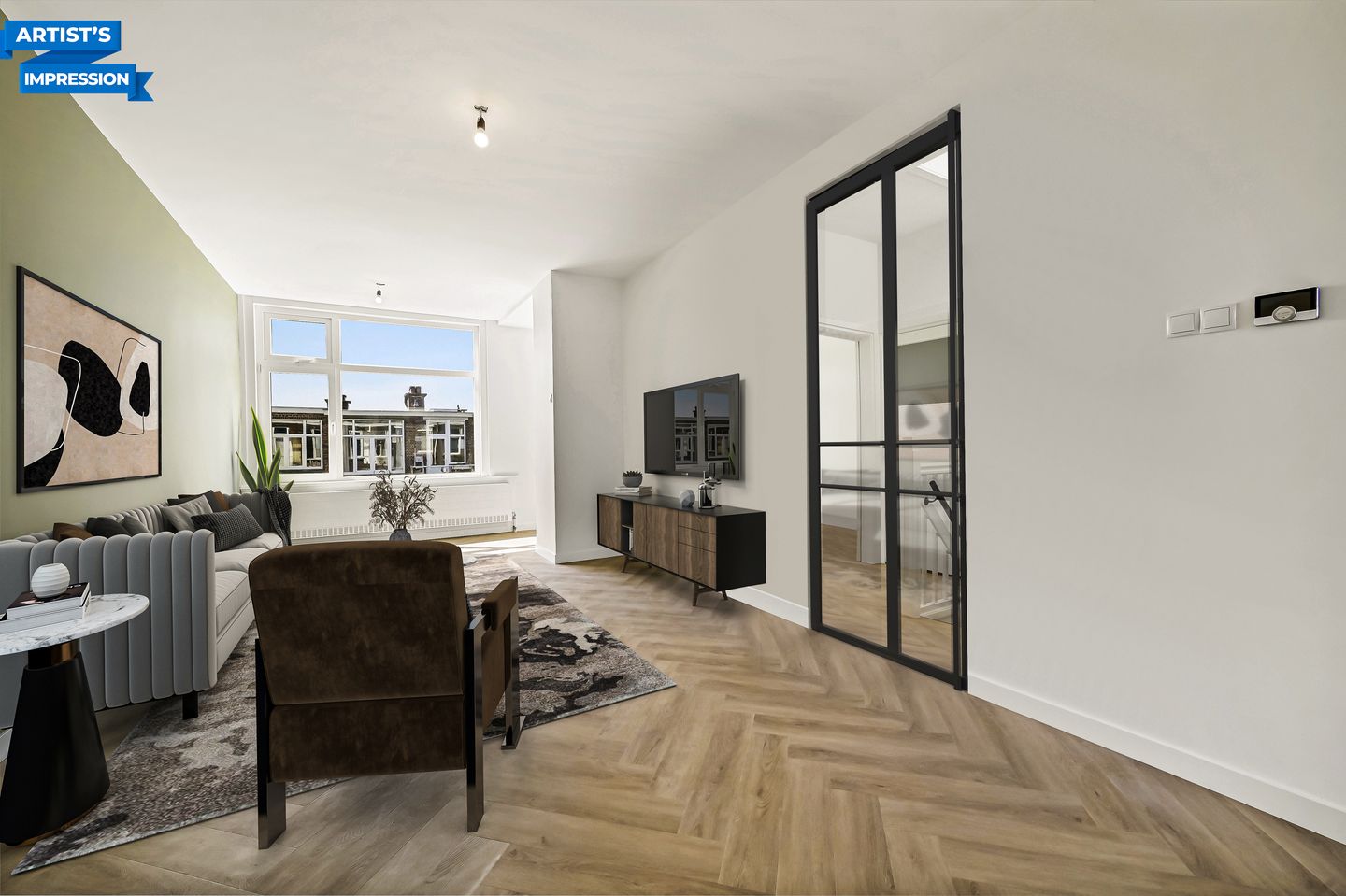 Het zwarte staal-look kozijn tussen woonkamer en gang is inmiddels geplaatst.