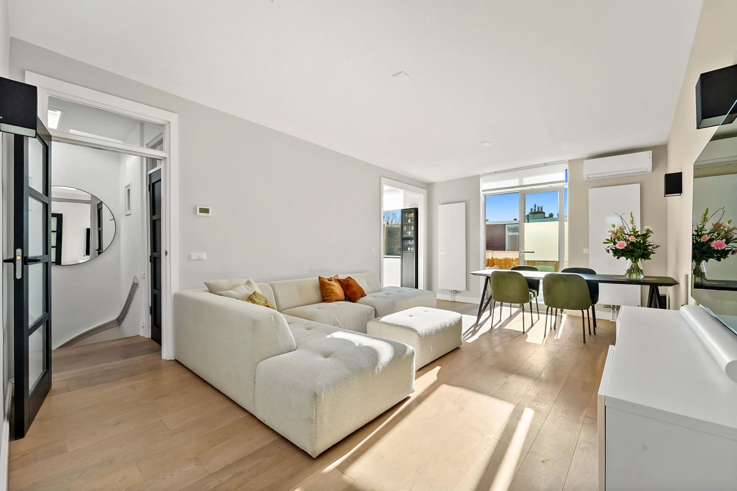 Layout: The entrance on the first floor is reached through a secure porch. There is space for a coat closet in the hallway, after which you take the stairs to the top floor. The landing features practical built-in wardrobes with connections for the washing machine and dryer, as well as the central heating system, neatly tucked away. At the rear of the house is the bright living/dining room. Large windows and sliding doors provide ample natural light, providing direct access to the spacious, sunny terrace, which forms a pleasant extension of the living space. The semi-open kitchen connects to the living room and is modernly equipped with various built-in appliances, including a 4-burner gas cooktop, extractor hood, oven, dishwasher, and fridge/freezer. At the front of the house are two bedrooms. The master bedroom is well-sized, and the second bedroom is suitable as a bedroom, office, or guest room. The bathroom is luxuriously finished and features a walk-in shower, double vanity, heated towel rail, and toilet. The entire house has oak flooring, HR+ glass in PVC frames, and air conditioning.