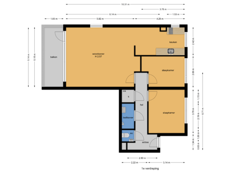 De 2e slaapkamer ca. 2.70m x 3.75m heeft een handige nis voor een kledingkast. De open keuken is voorzien van eenvoudig keukenblok.