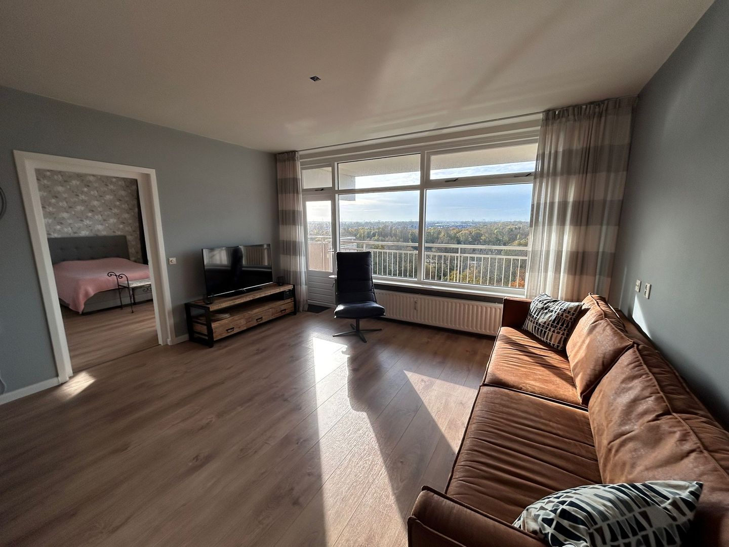 Entree appartement: vestibule met vaste kast voorzien van garderoberuimte en meterkast, separaat toilet met fonteintje. Ruime en lichte woon-/eetkamer met fraai uitzicht en toegang tot het royale balkon op het zuidwesten.