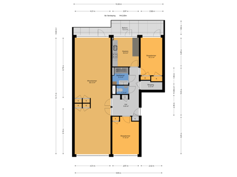 6th Floor: porch with entrance to the apartment, spacious hallway with wardrobe, meter cupboard and storage cupboard, the entire apartment is fitted with a beautiful wood-look laminate floor with wide floorboards. Neat modern toilet with sink, tidy bathroom featuring white wall tiles and anthracite floor tiles, bath, washbasin unit with mirror cabinet. Bedroom at the front with large window and built-in wardrobe. Living room divided into front and back room partly separated by a built-in cupboard wall. Beautiful spacious kitchen, fitted with wood-look laminate floor, kitchen in wall arrangement with light cupboards, plenty of storage space, plastic worktop, 4-burner gas hob, oven, stainless steel sink, semi-high fridge and freezer. Back bedroom with built-in wardrobes and French doors. From the living room, the back bedroom, and the kitchen, the lovely balcony/terrace facing southwest is accessible. There is a spacious storage room in the basement.