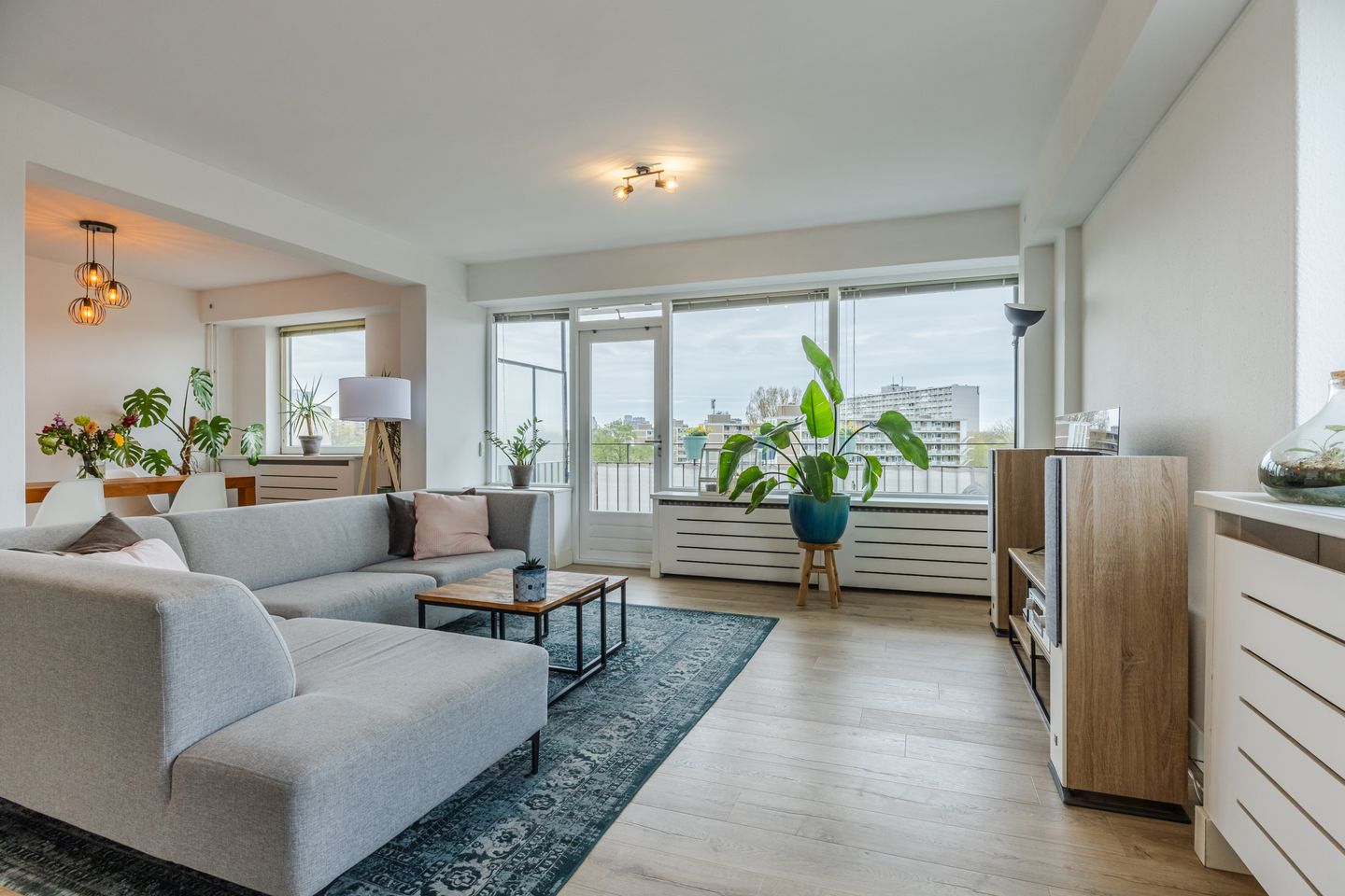 U bereikt de woning via het afgesloten portiek met trap en lift naar de vijfde etage. Bij binnenkomst van het appartement betreedt u de centrale hal, die toegang geeft tot alle vertrekken. De lichte woonkamer met grote raampartijen biedt een prettige ruime leefruimte met aansluitend de eetkamer, die eenvoudig kan worden omgebouwd tot een derde slaapkamer.