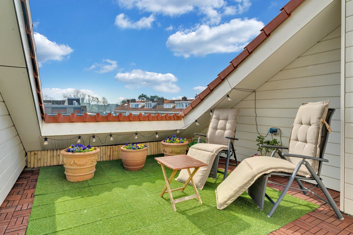 The spiral staircase to the top floor leads to a landing with access to the spacious terrace of 11.4 m2 facing south. This sunny and beautiful outdoor space is inside the pitched roof laid out, so the privacy experience is optimal. There is fine view of skyline of the surrounding sought after neighborhood. The terrace has a large closet as practical storage space for example lounge cushions. The 3 other fine rooms of this top floor are the 2nd and 3rd bedroom and the spacious (2nd) bathroom. Both bedrooms are located at the rear of the house and both have a wide dormer. The right bedroom also has a large closet. The bathroom has a large velux skylight, bath, separate shower, toilet, washbasin and an alcove with space for washing machine and dryer. The hallway also gives access through a hatch to a large storage attic. There is also a spacious private storage room in the basement.