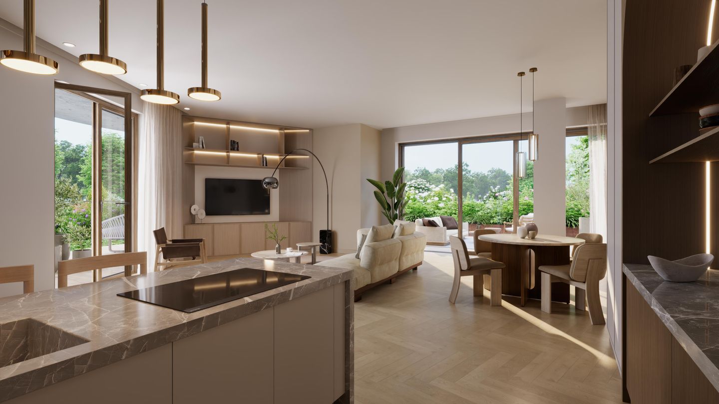 De ruime woonkamer van circa 58 m² vormt het hart van de woning en wordt dankzij lichtinval aan drie zijden overspoeld met daglicht, wat zorgt voor een comfortabele en open leefruimte.
